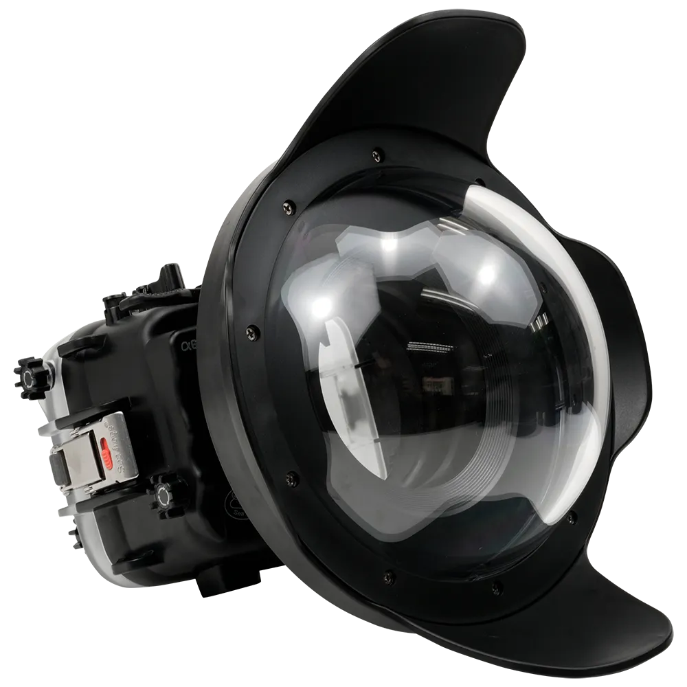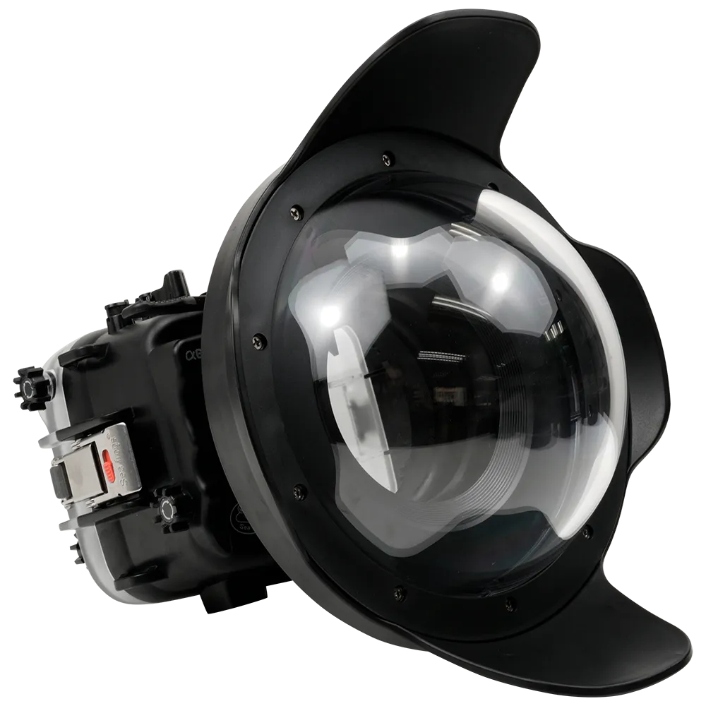 The Salted Line A6700 Housing, paired with a 6-inch Optically Correct Acrylic V7 Dome Port and a 37mm length extension adapter ring, supports a variety of fisheye and wide-angle zoom and prime E-mount lenses.